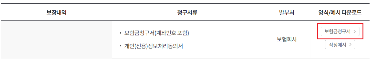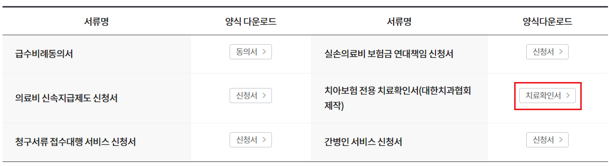 상단 필요서류 안내 접속 시 보험금청구서와 치과치료확인서 다운로드가 가능합니다.