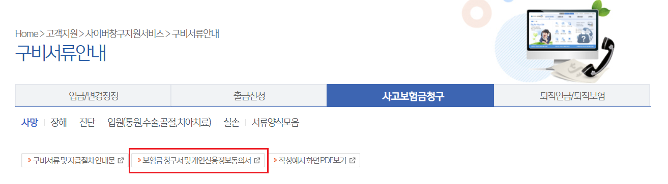 ㄷ. 사고보험금청구 -> 보험금청구서 및 개인신용정보동의서 다운로드 후 출력하면 됩니다.