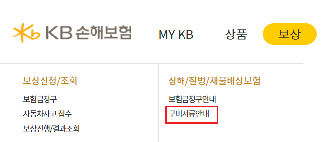 ㄴ. 상단 보상 클릭 후 상해/질병/재물보상보험 카테고리 내 "구비서류안내"를 클릭해주세요