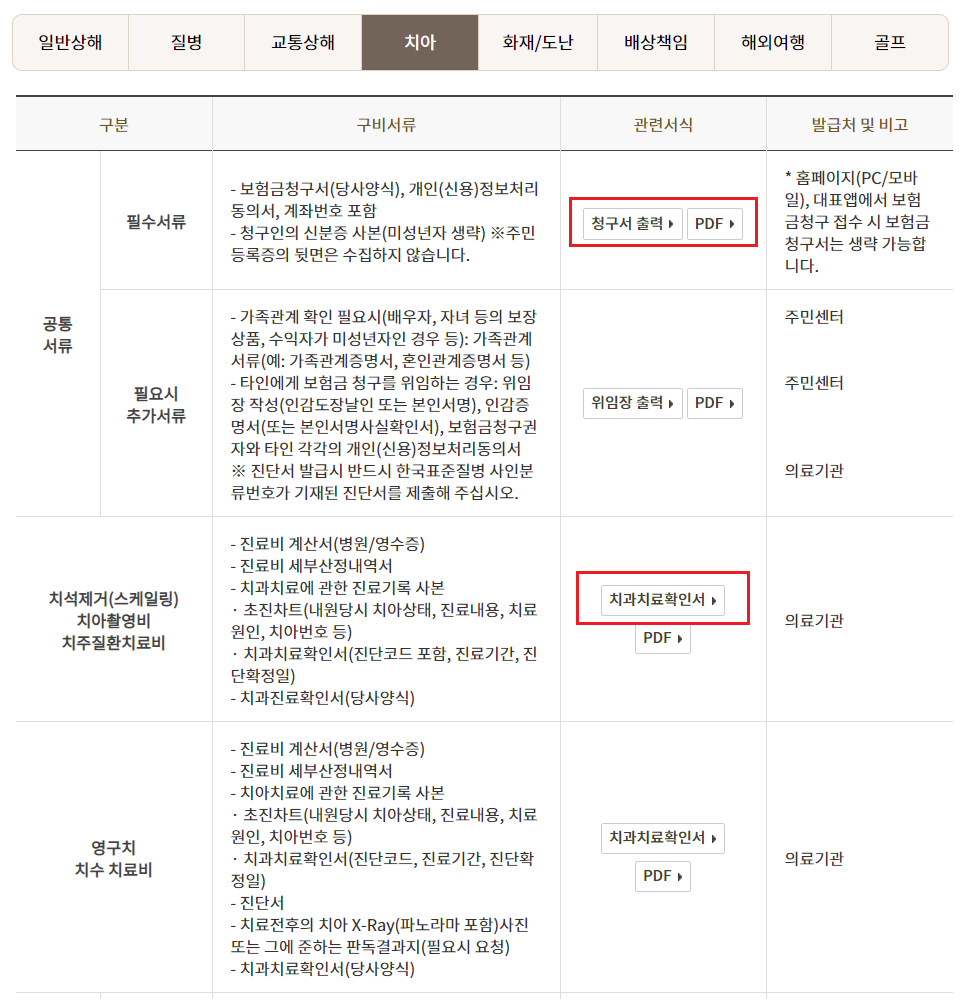 - 보험금청구서 / 개인 (신용) 정보처리동의서 / 치과치료확인서 (KB손해보험 공식사이트에서 출력 가능)