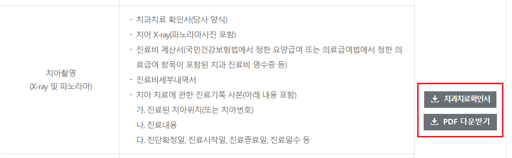 - 치아 치료에 관한 진료기록 사본 (아래 내용 포함)