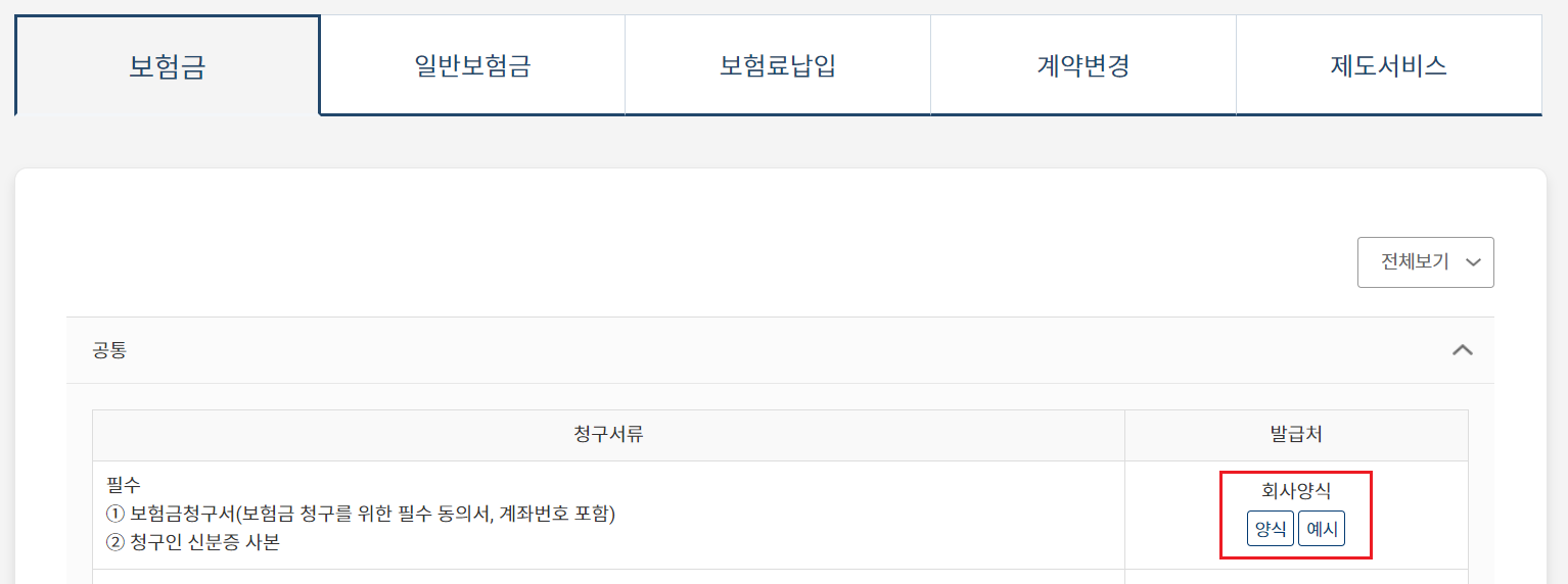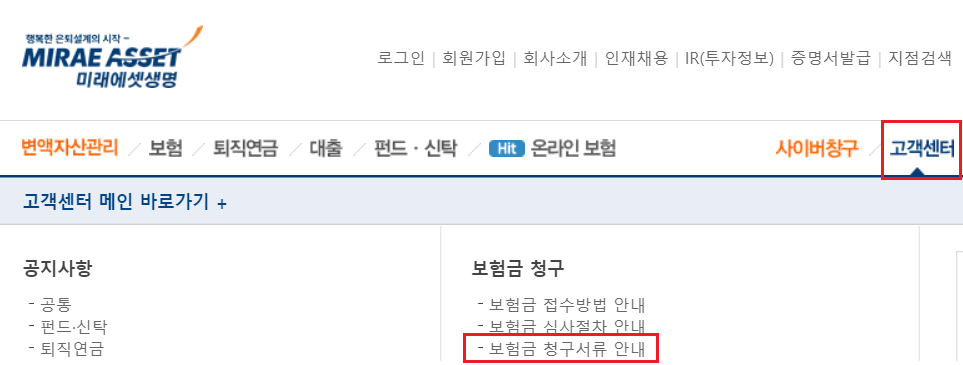 1. 미래에셋생명 사이트 검색해주세요![]() 2. 상단 고객센터 클릭 후 "보험금 청구서류 안내" 클릭해주세요 ![]() 3. 회사양식 쪽 통해서 양식을 클릭하여 보험금청구서를 받을 수 있습니다. ![]() |