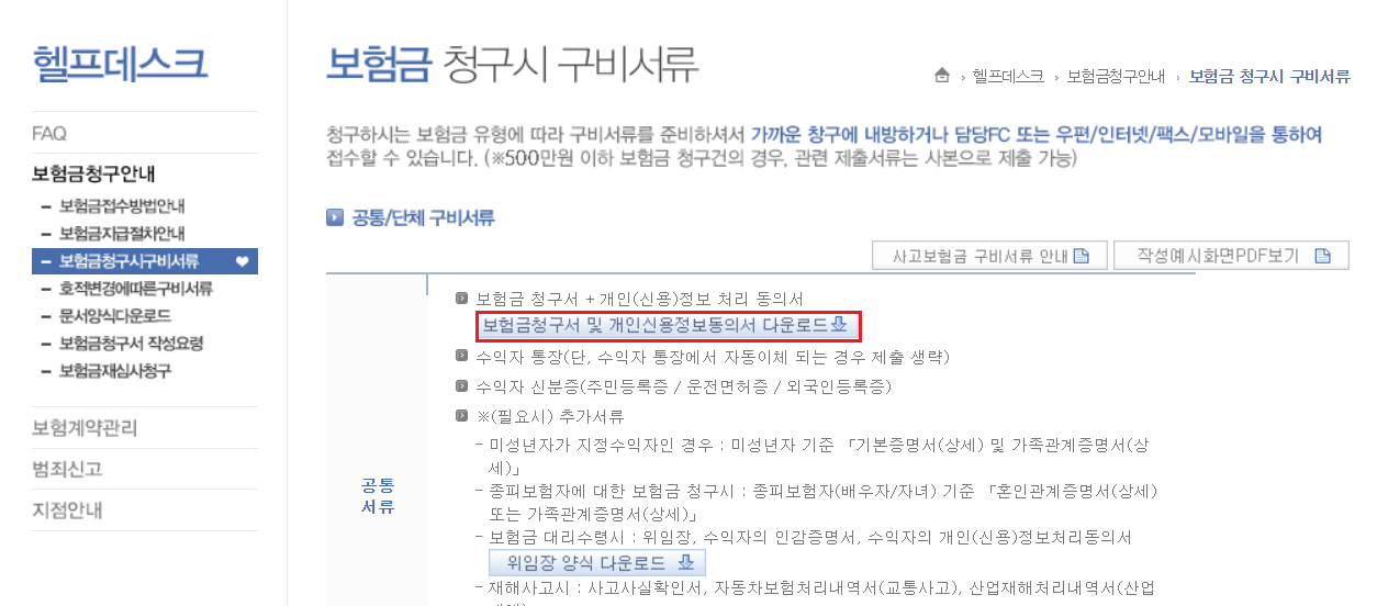 ▶ 헬프데스크 -> 보험금청구안내 -> 보험금 청구 시 구비서류 -> 보험금청구서 및 개인신용정보동의서 다운로드 버튼 클릭