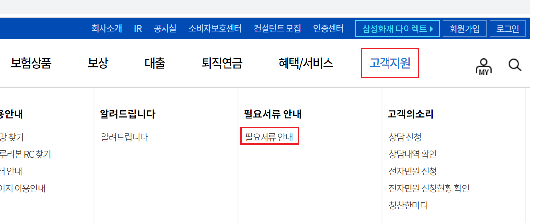 삼성화재 사이트 -> 고객지원 -> 필요서류 안내 -> 장기/일반보험금 청구