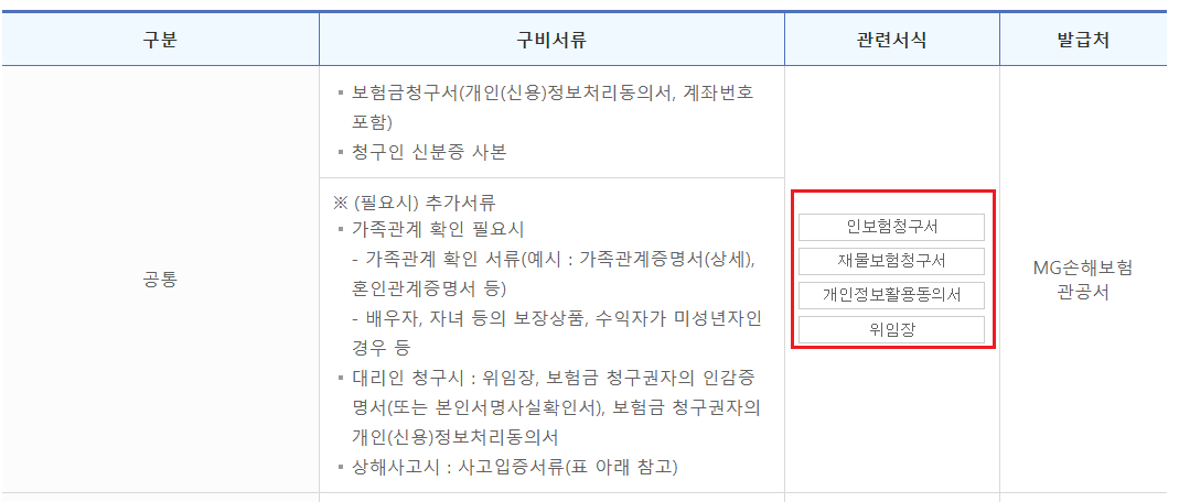 - 보험금청구서 (MG손해보험 공식 사이트에서 다운로드 후 출력가능)