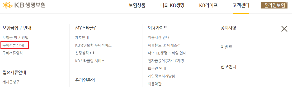 KB생명보험 사이트 -> 상단 고객센터 -> 보험금청구안내 -> 구비서류안내