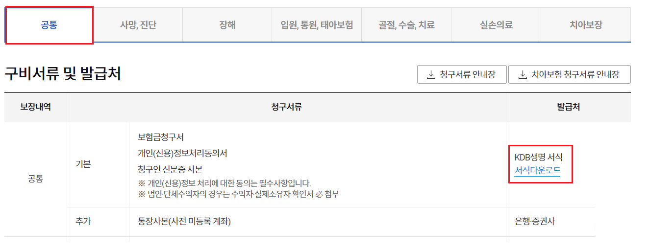 ㄴ 하단 쪽 위치 구비서류안내 -> 공통 -> KDB생명 서식 다운로드 (보험금청구서)