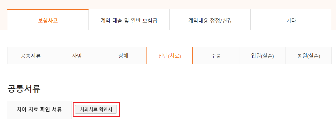 한화생명 공식 사이트 ▶ 전체메뉴 ▶ 보험 ▶ 소비자포털 ▶ 구비서류안내 ▶ 공통서류 ▶ 치과치료확인서