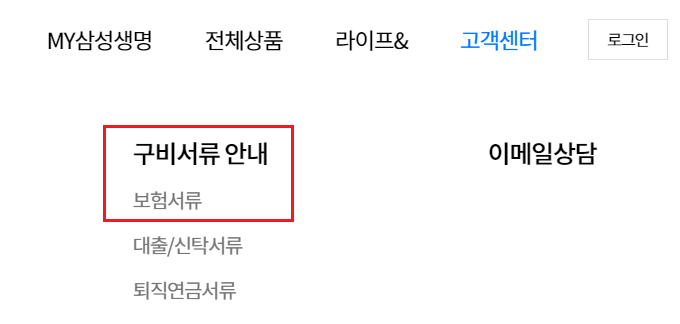삼성생명 사이트 접속 후 상단카테고리 "구비서류안내" -> "보험서류" 통해서 다운로드 가능합니다.