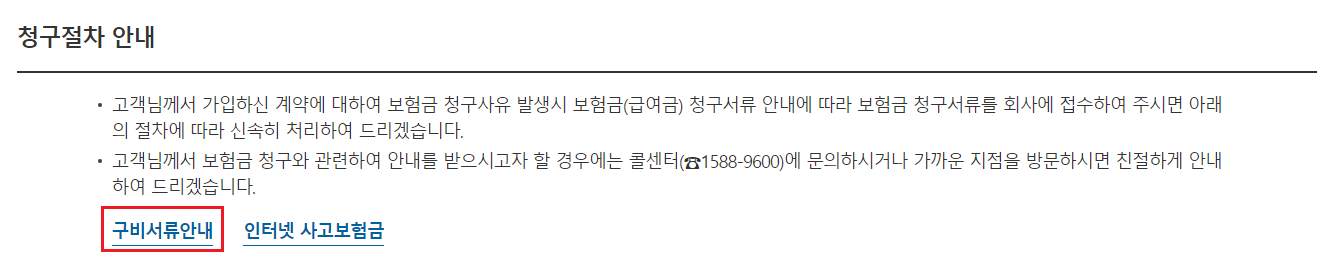 사고보험금 -> 청구절차안내 (구비서류안내) 통해서 필요한 서류에 대해서 다운로드가 가능합니다.