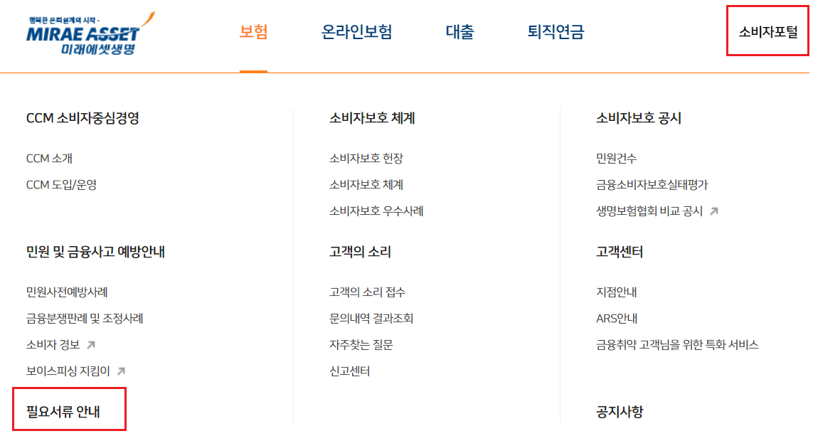 미래에셋생명 홈페이지 접속 후 상단 "소비자포털" 클릭 후 필요서류안내에서 다운로드 가능합니다.