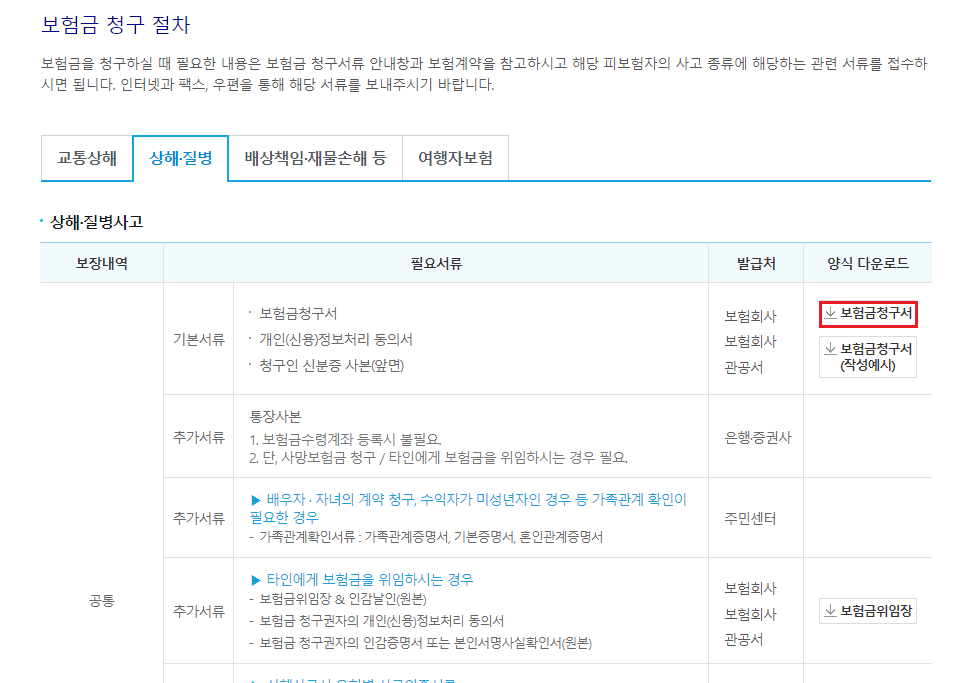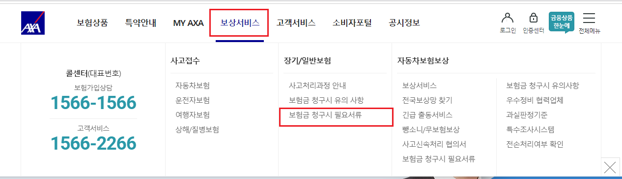 2. "보상서비스" -> "보험금 청구시 필요서류" 항목 클릭하기